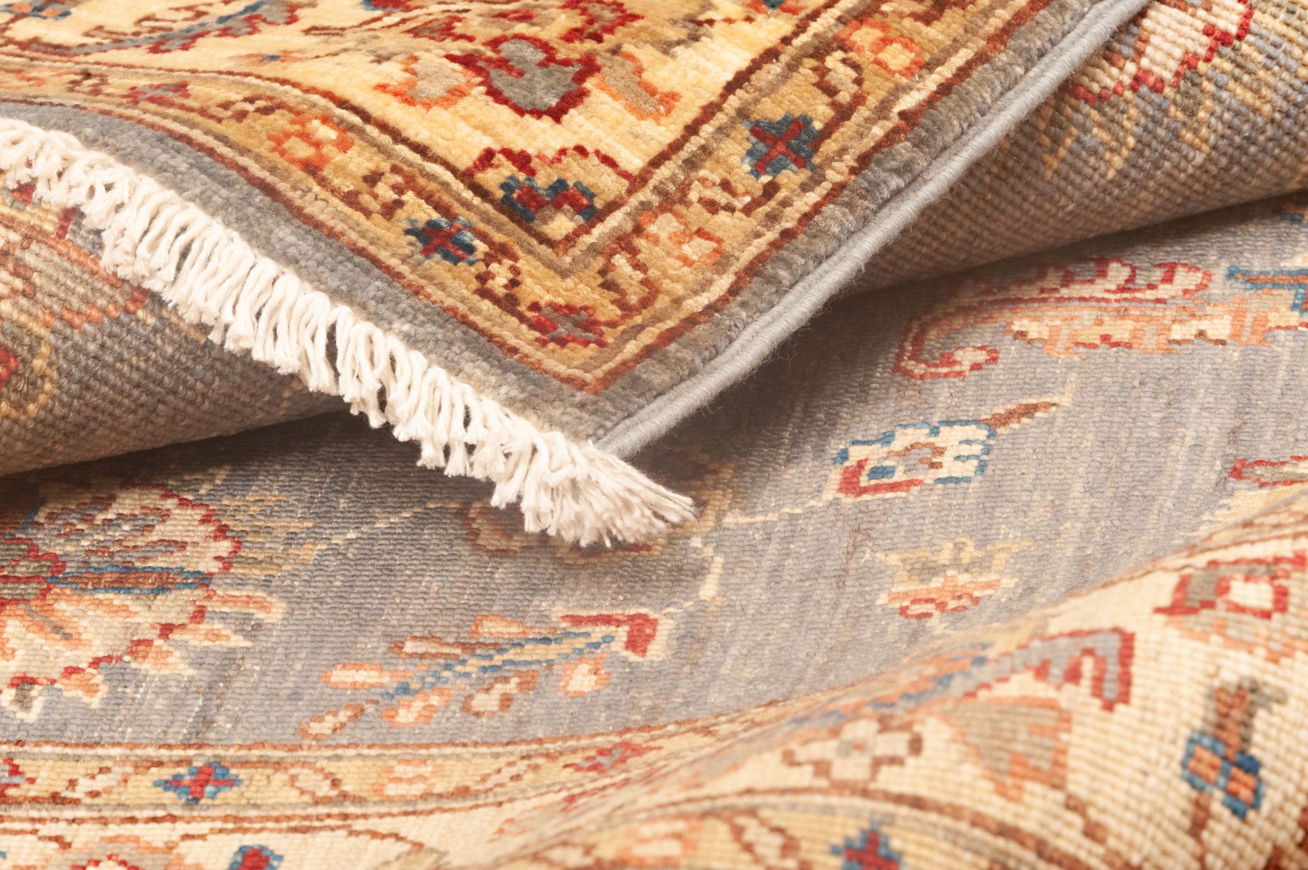 Questi tappeti  sono annodati a mano secondo tradizione da tribù nomadi in Afghanistan. Sia per quanto riguarda le materie prime che per le rifiniture queste opere sono di fattura estremamente pregevole. I colori prevalenti sono le tonalità vivaci del giallo e dell’arancio, il beige. Questo particolare esemplare di tappeto ha un fondo di colore grigio perla e decori di chiari. Dimensioni:149×100 cm.