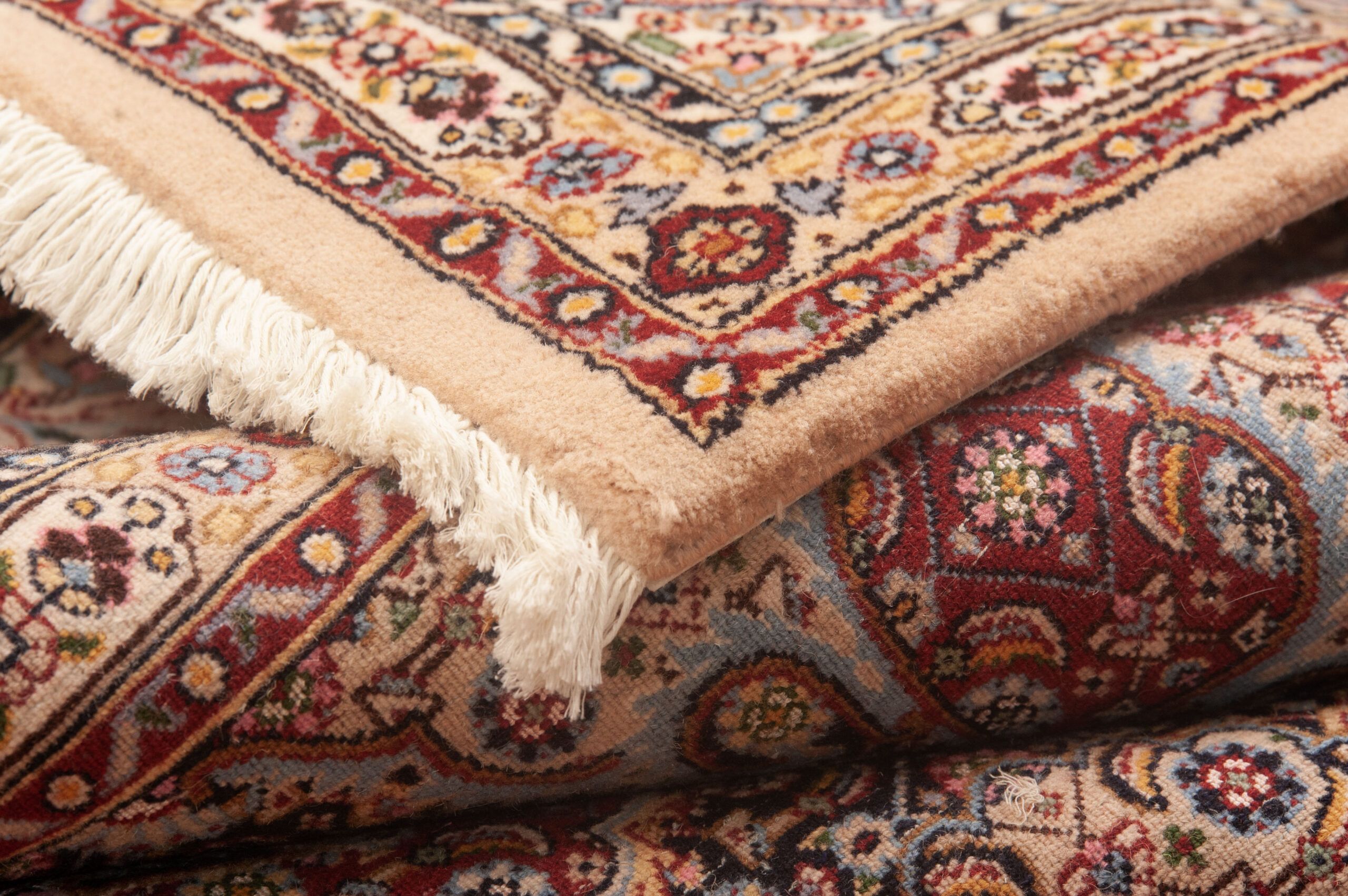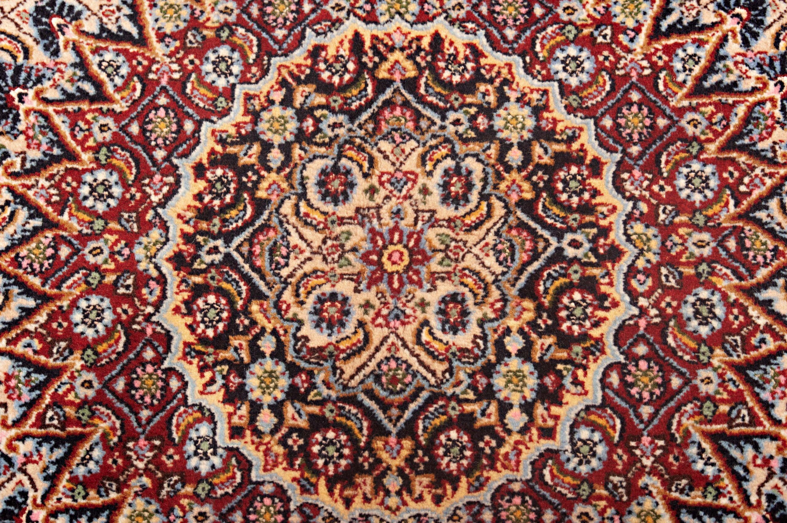 La città di Mood si trova in Iran a 300 chilometri a sud di Mashad dalla quale città è stata influenzata nella produzione di preziosi esemplari di tappeti, sontuosi nei disegni e di elevata qualità esecutiva. Iconograficamente prevale l’impianto con medaglione centrale. Il campo presenta spesso motivi Herati, caratterizzati da un fiore all’interno di un rombo circondato da foglie di acanto, o motivi campestri stilizzati. Le tonalità principali sono il beige con una sfumatura rosso chiaro o blu. I nodi utilizzano doppia trama. Questo tappeto Mood presenta il classico motivo floreale con medaglione centrale ricco di decori floreali e nella tradizionale tonalità del beige, con un tocco rosso che rende il tappeto elegante e raffinato. Dimensioni: 210×147 cm.