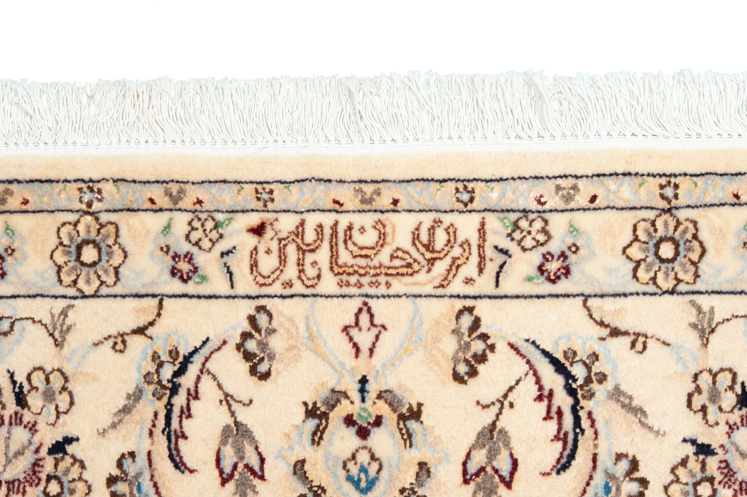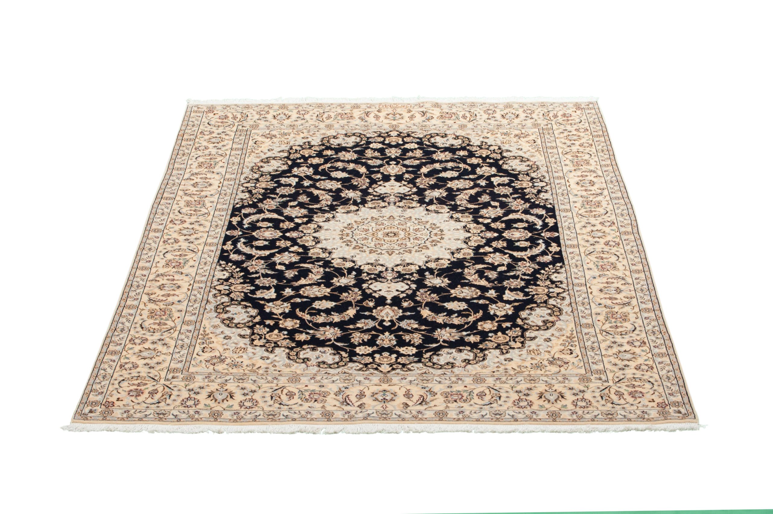 Nella celebre città di Nain, 200 chilometri a est di Isfahan in Iran, sono realizzati i famosi tappeti Nain che godono di un’ottima reputazione. II prodotto artigianale è un manufatto raffinato ed elegante. Sia il materiale che la realizzazione è di primissima classe. Trama ed ordito di questi manufatti sono di cotone, il vello è di seta, di lana, oppure di entrambi i materiali. Il materiale nei tappeti più esclusivo è costituito da lana su un ordito di seta, utilizzando la seta sia per l’ordito che la trama. Inoltre i tappeti persiani Nain sono annodati con nodi persiani il cui numero varia da 250.000 a un milione al metro quadrato. Caratteristica fondamentale dei tappeti di Nain è l’uso costante dei colori dai toni freddi. Prediletti sono infatti il bianco, il blu, l’azzurro cielo, il beige e solo raramente il rosso. Comuni sono il motivo con il medaglione centrale, gli arabeschi e i motivi floreali. È un pezzo unico realizzato a mano. Questo tappeto persiano ha un maestoso medaglione centrale e decori floreali sul campo a sfondo nero. Dimensioni: 235×150 cm.