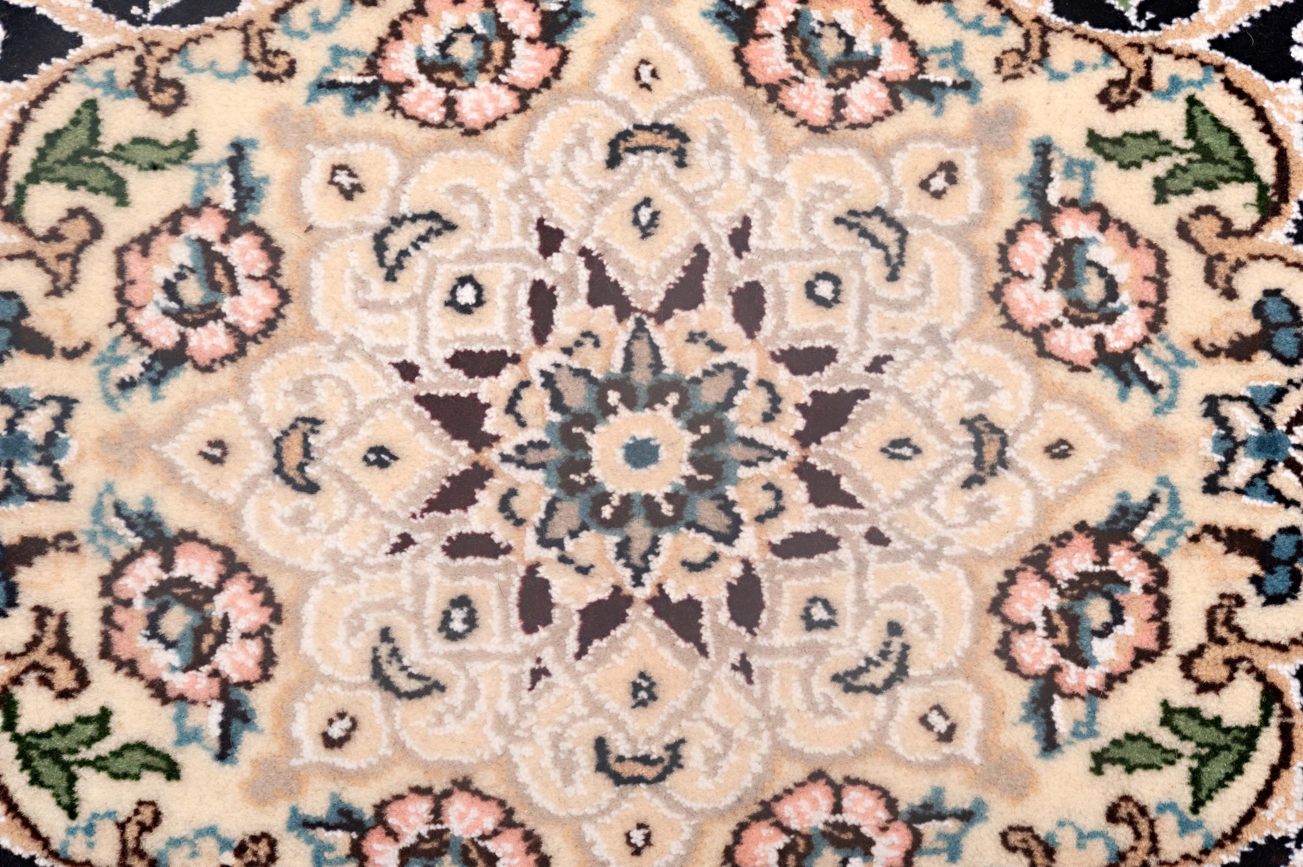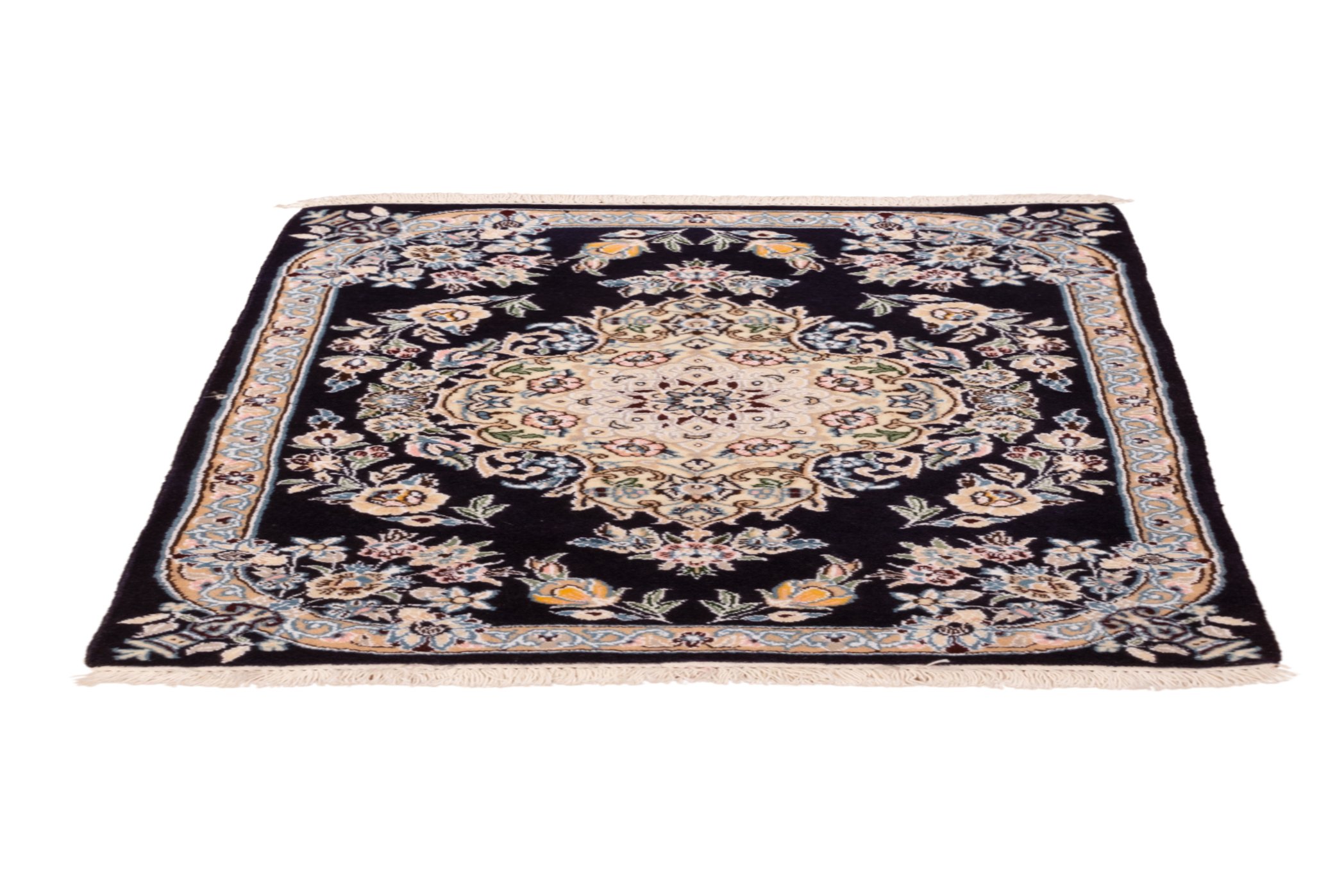 Nella celebre città di Nain, 200 chilometri a est di Isfahan in Iran, sono realizzati i famosi tappeti Nain che godono di un’ottima reputazione. II prodotto artigianale è un manufatto raffinato ed elegante. Sia il materiale che la realizzazione è di primissima classe. Trama ed ordito di questi manufatti sono di cotone, il vello è di seta, di lana, oppure di entrambi i materiali. Il materiale nei tappeti più esclusivo è costituito da lana su un ordito di seta, utilizzando la seta sia per l’ordito che la trama. Inoltre i tappeti persiani Nain sono annodati con nodi persiani il cui numero varia da 250.000 a un milione al metro quadrato. Caratteristica fondamentale dei tappeti di Nain è l’uso costante dei colori dai toni freddi. Prediletti sono infatti il bianco, il blu, l’azzurro cielo, il beige e solo raramente il rosso. Comuni sono il motivo con il medaglione centrale, gli arabeschi e i motivi floreali. È un pezzo unico realizzato a mano. Questo tappeto persiano ha un maestoso medaglione centrale e decori floreali sul campo a sfondo scuro. Dimensioni  92x64cm