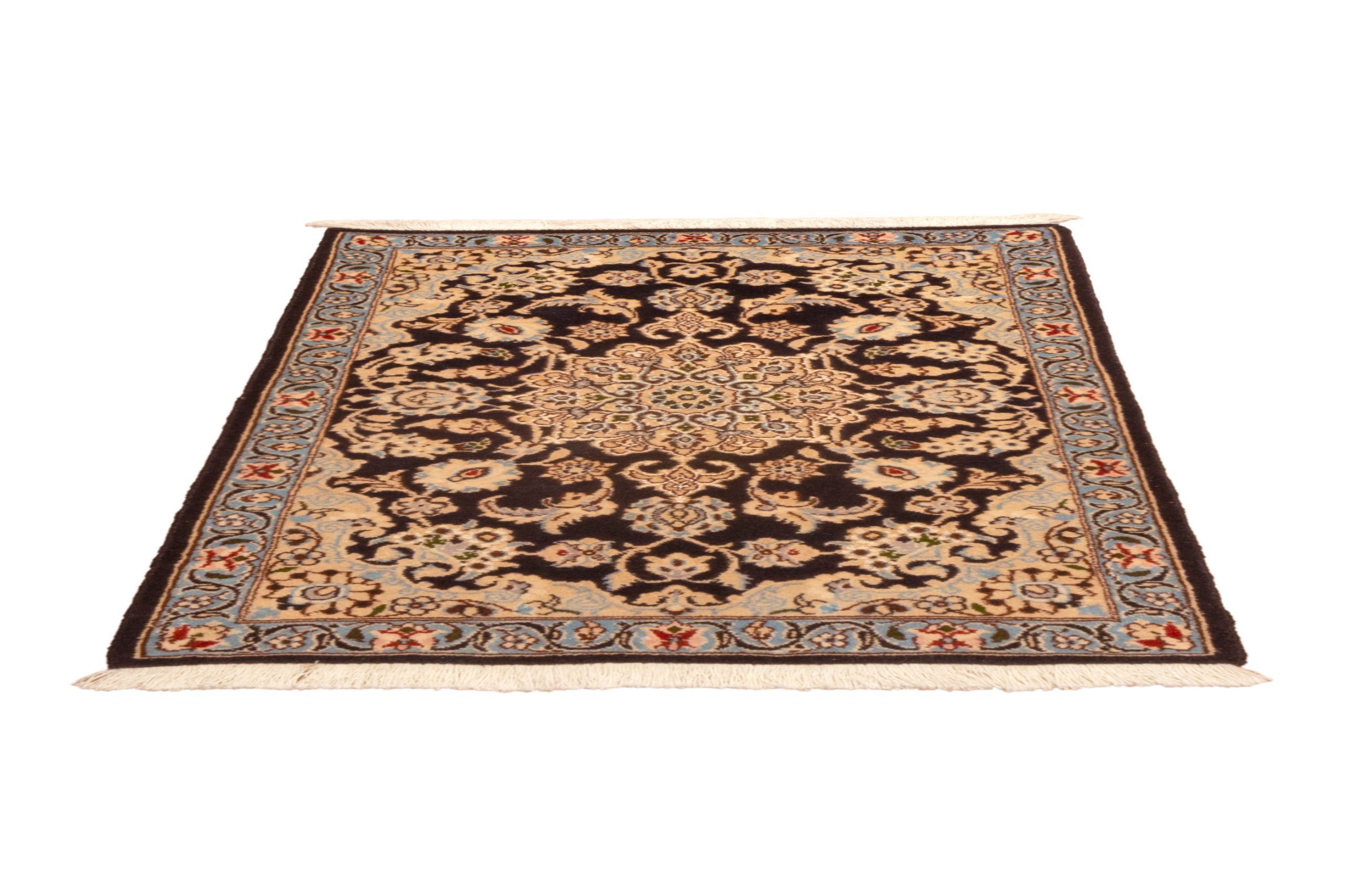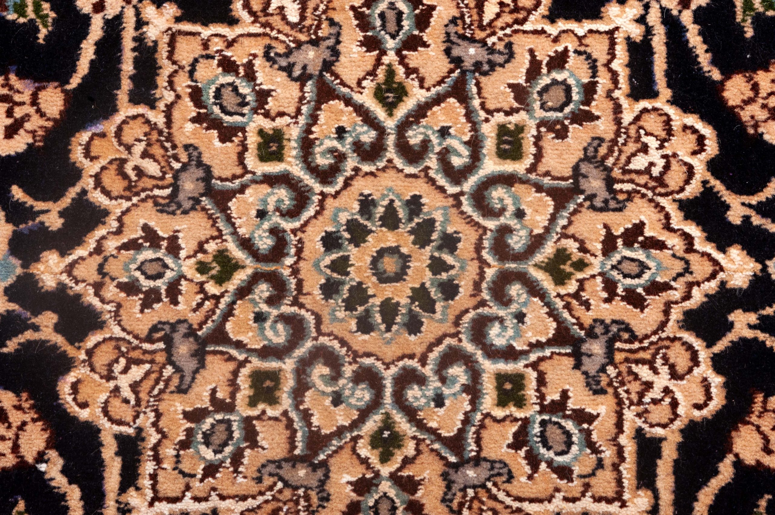 Nella celebre città di Nain, 200 chilometri a est di Isfahan in Iran, sono realizzati i famosi tappeti Nain che godono di un’ottima reputazione. II prodotto artigianale è un manufatto raffinato ed elegante. Sia il materiale che la realizzazione è di primissima classe. Trama ed ordito di questi manufatti sono di cotone, il vello è di seta, di lana, oppure di entrambi i materiali. Il materiale nei tappeti più esclusivo è costituito da lana su un ordito di seta, utilizzando la seta sia per l’ordito che la trama. Inoltre i tappeti persiani Nain sono annodati con nodi persiani il cui numero varia da 250.000 a un milione al metro quadrato. Caratteristica fondamentale dei tappeti di Nain è l’uso costante dei colori dai toni freddi. Prediletti sono infatti il bianco, il blu, l’azzurro cielo, il beige e solo raramente il rosso. Comuni sono il motivo con il medaglione centrale, gli arabeschi e i motivi floreali. È un pezzo unico realizzato a mano. Questo tappeto persiano ha un maestoso medaglione centrale su fondo scuro e una cornice tono su tono con decori floreali. Dimensioni 97x 65cm