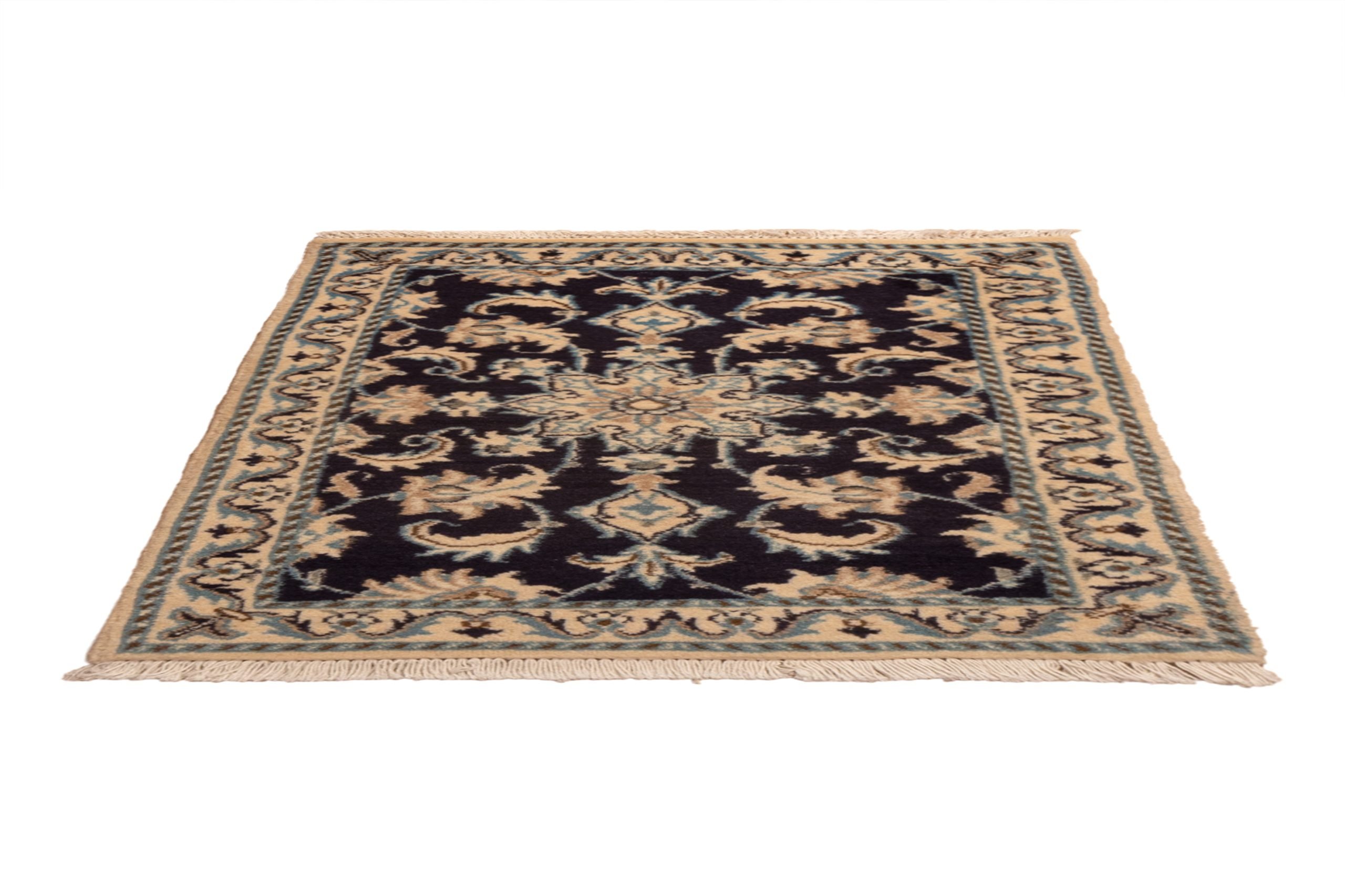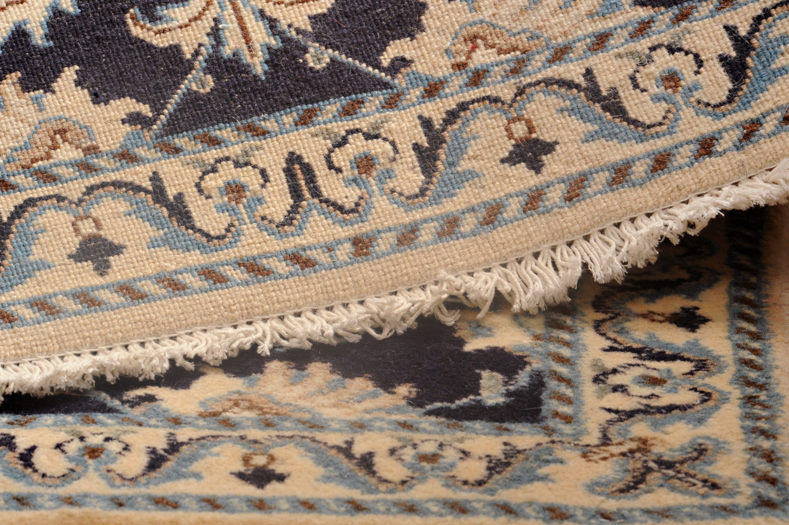 Nella celebre città di Nain, 200 chilometri a est di Isfahan in Iran, sono realizzati i famosi tappeti Nain che godono di un’ottima reputazione. II prodotto artigianale è un manufatto raffinato ed elegante. Sia il materiale che la realizzazione è di primissima classe. Trama ed ordito di questi manufatti sono di cotone, il vello è di seta, di lana, oppure di entrambi i materiali. Il materiale nei tappeti più esclusivo è costituito da lana su un ordito di seta, utilizzando la seta sia per l’ordito che la trama. Inoltre i tappeti persiani Nain sono annodati con nodi persiani il cui numero varia da 250.000 a un milione al metro quadrato. Caratteristica fondamentale dei tappeti di Nain è l’uso costante dei colori dai toni freddi. Prediletti sono infatti il bianco, il blu, l’azzurro cielo, il beige e solo raramente il rosso. Comuni sono il motivo con il medaglione centrale, gli arabeschi e i motivi floreali. È un pezzo unico realizzato a mano. Questo tappeto persiano ha un medaglione centrale e decori floreali sul campo a sfondo scuro. Dimensioni 90x60cm.