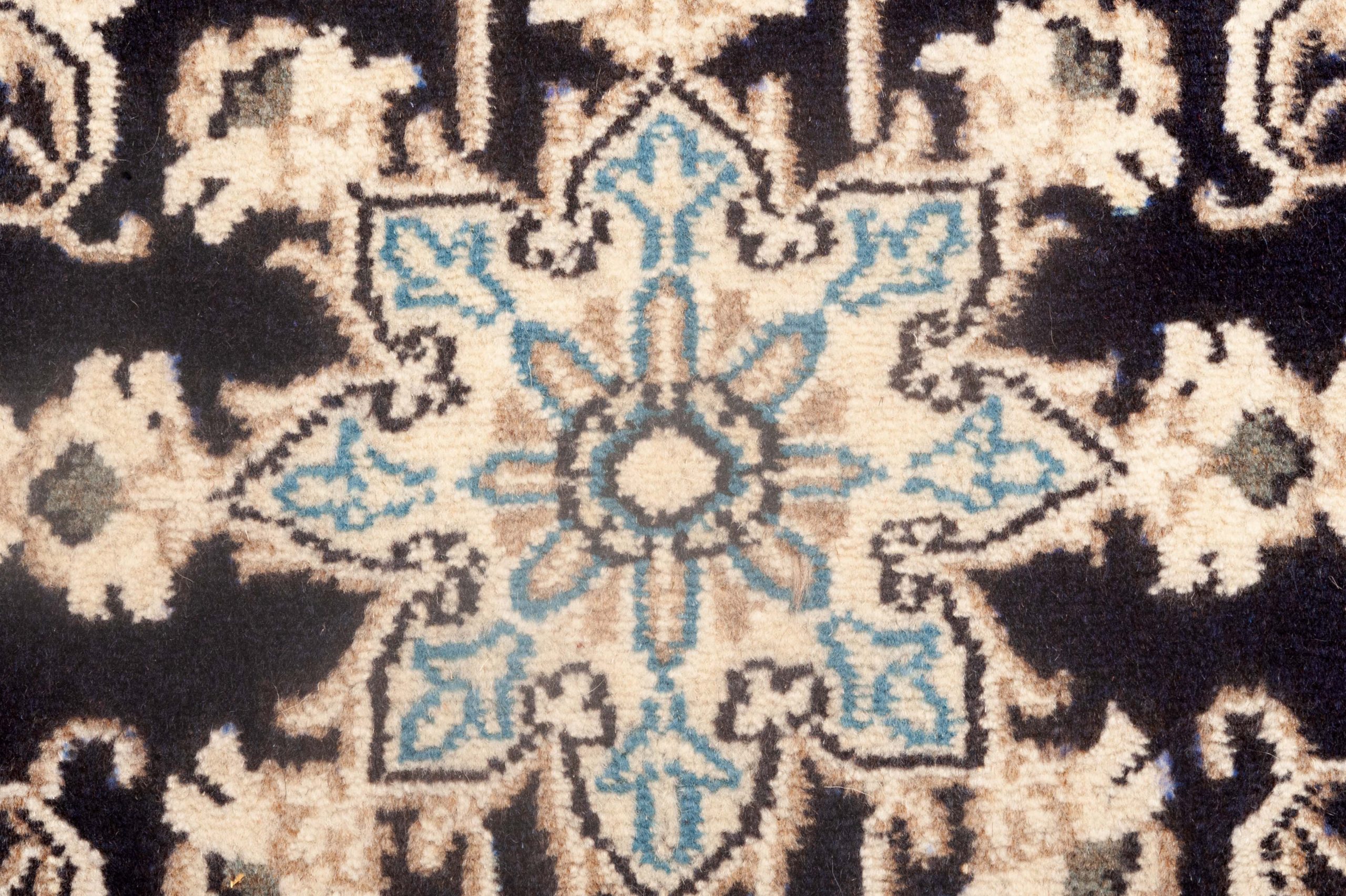 Nella celebre città di Nain, 200 chilometri a est di Isfahan in Iran, sono realizzati i famosi tappeti Nain che godono di un’ottima reputazione. II prodotto artigianale è un manufatto raffinato ed elegante. Sia il materiale che la realizzazione è di primissima classe. Trama ed ordito di questi manufatti sono di cotone, il vello è di seta, di lana, oppure di entrambi i materiali. Il materiale nei tappeti più esclusivo è costituito da lana su un ordito di seta, utilizzando la seta sia per l’ordito che la trama. Inoltre i tappeti persiani Nain sono annodati con nodi persiani il cui numero varia da 250.000 a un milione al metro quadrato. Caratteristica fondamentale dei tappeti di Nain è l’uso costante dei colori dai toni freddi. Prediletti sono infatti il bianco, il blu, l’azzurro cielo, il beige e solo raramente il rosso. Comuni sono il motivo con il medaglione centrale, gli arabeschi e i motivi floreali. È un pezzo unico realizzato a mano. Questo tappeto persiano ha un medaglione centrale e decori floreali sul campo a sfondo scuro. Dimensioni  90x60cm.