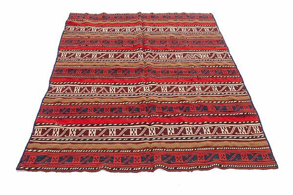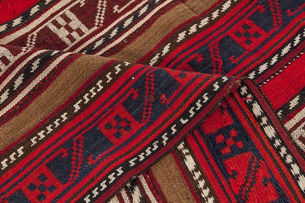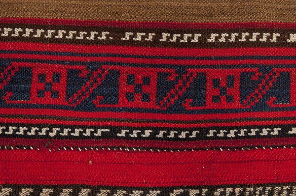 I tappeti persiani Giagim (o Cicim), tessuti in Iran, prendono il loro nome da una tecnica di lavorazione, il Giagim per l’appunto. Questo tipo di lavorazione rende il tessuto compatto e ricamato a prima vista. In realtà, il rilievo caratteristico del cicim viene raggiunto attraverso l’avvolgimento dei fili orizzontali intorno a due o tre fili dell’ordito che lo rendono particolarmente leggero. Il tappeto persiano Giagim viene tessuto a mano in strisce larghe circa 50 cm e lunghe tra 10 e 20 m. Successivamente le strisce vengono tagliate e ricucite una accanto all’altra. Questo esemplare unico di tappeto persiano Giagim è caratterizzato dall’alternanza di strisce cromatiche e design geometrico. Dimensioni: 172×151 cm.